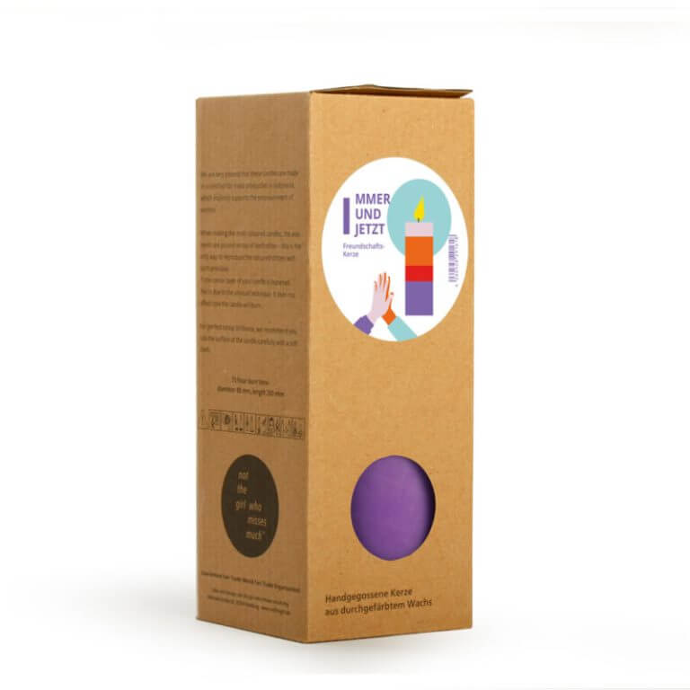 Minimalisitisch und in brillanten Farben haben wir in unseren Kerzen Farbcodes umgesetzt, die sich auf unterschiedliche Lebensaspekte beziehen. Jede Kerze wird so zur Botschaft und zum Geschenk, das Glückwünsche und Grüße übermittelt. Bei uns findet jedes Thema seine Kerze und jede Kerze ein neues Thema. Die Kerzen werden aus durchgefärbtem, pflanzlichen Wachs handgefertigt. Die Verpackungen, die in Hamburg klimaneutral auf FSC-zertifiziertem Designpapier gedruckt und weiterverarbeitet werden, sind zweisprachig: eine Seite auf Deutsch, die andere auf Englisch.
