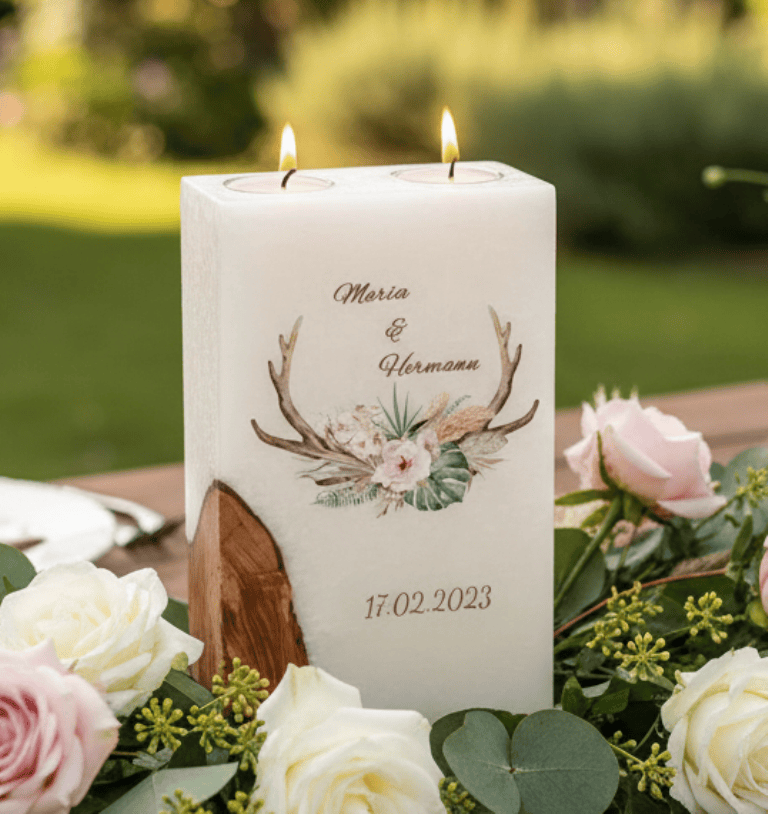 "Geweih" Hochzeitskerze mit 1 Holzelement und 2 Teelichter 20 x 20 cm "selbstgestaltet und Oberfläche versiegelt "Hochzeitskerze mit Holzelement aus Stearin.Eine einmalige Optik durch das Eingießen des Holzelementes, welches für sich schon ein Unikat ist.Liebevolle Handarbeit für ein Kunstwerk aus Holz und Wachs.Jede Kerze mit Holz wird von Hand hergestellt und bearbeitet.Durch das Personalisieren Ihrer Hochzeitskerze entsteht eine einmalige Optik, welches die Kerze für Sie zu einem Erinnerungsstück und Wegbegleiter macht.Sie erhalten vor der Anfertigung einen Entwurf (Bild) mit der Originalkerze zur Freigabe.1 x Korrektur ist kostenfrei.Jede unserer hochwertigen individuellen Hochzeitskerzen wird mit Hilfe von hochwertigen LED- und/oder UV-Druckverfahren veredelt.Die Verzierungen sind Oberflächenversiegelt und können daher auch normal angefasst werden.Die Versiegelung wird durch Handarbeit aufgebracht und hat in sich eine eigene Struktur.Diese Abbildung ist nur ein Beispielbild. Die Holzoptik kann vom Bild erheblich abweichen.Gerne können Sie sich eine Wunschkerze direkt bei unseren Kerzen aus Holz aussuchen.Dekomaterial ist nicht Bestandteil der Bestellung.Hersteller-Artikel-Nr.: RUGHZT210222