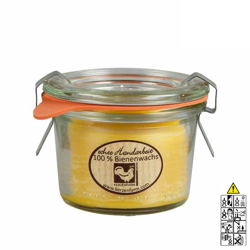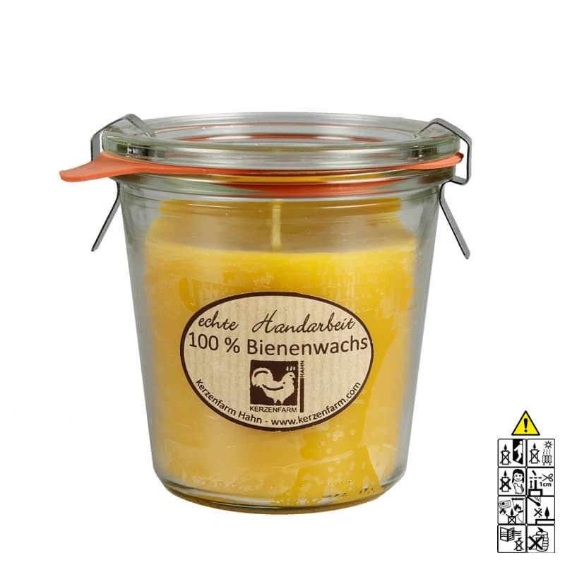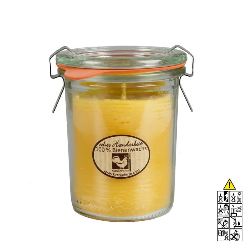 Bienenwachskerze im Weckglas®, 290 ml. Ca. 36 h Brenndauer.Es ist frei von mechanischen Verunreinigungen. Bienenwachskerzen verfügen über eine lange Brenndauer, sie brennen ruß- und tropffrei mit ruhiger Flamme. Die Bienenwachskerzen sind von Hand gegossen. Der Rohstoff besteht aus reinem Bienenwachs. Dieses wird mit Spezialverfahren ohne Zusätze von Chemikalien gereinigt und unterliegt einer strengen Schadstoffkontrolle.Charakteristisch ist der typische, wohlriechende Duft nach Honig und die natürlich seidige, opake Oberfläche. Von Hand gegossene Kerze aus reinem Bienenwachs im Original-Weckglas®.Hersteller-Artikel-Nr.: 34801