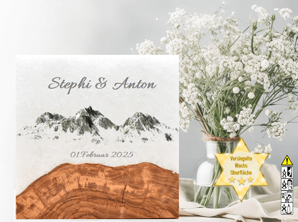 "Berge" Hochzeitskerze mit Holzelement 30 cm hoch "selbstgestaltet und Oberfläche versiegelt "Hochzeitskerze mit Holzelement aus Stearin.Eine einmalige Optik durch das Eingießen des Holzelementes, welches für sich schon ein Unikat ist.Liebevolle Handarbeit für ein Kunstwerk aus Holz und Wachs.Jede Kerze mit Holz wird von Hand hergestellt und bearbeitet.Durch das Personalisieren Ihrer Hochzeitskerze entsteht eine einmalige Optik, welches die Kerze für Sie zu einem Erinnerungsstück und Wegbegleiter macht.Sie erhalten vor der Anfertigung einen Entwurf (Bild) mit der Originalkerze zur Freigabe.1 x Korrektur ist kostenfrei.Jede unserer hochwertigen individuellen Hochzeitskerzen wird mit Hilfe von hochwertigen LED- und/oder UV-Druckverfahren veredelt.Die Verzierungen sind Oberflächenversiegelt und können daher auch normal angefasst werden.Die Versiegelung wird durch Handarbeit aufgebracht und hat in sich eine eigene Struktur.Diese Abbildung ist nur ein Beispielbild. Die Holzoptik kann vom Bild erheblich abweichen.Gerne können Sie sich eine Wunschkerze direkt bei unseren Kerzen aus Holz aussuchen.Dekomaterial ist nicht Bestandteil der Bestellung.Hersteller-Artikel-Nr.: RUGHZT903180
