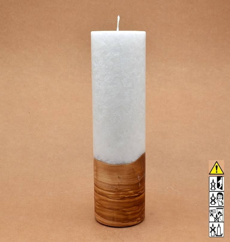 Runde Kerze in Stearinoptik 70 x 250 mm mit Holz und mit Dochteinsatz.