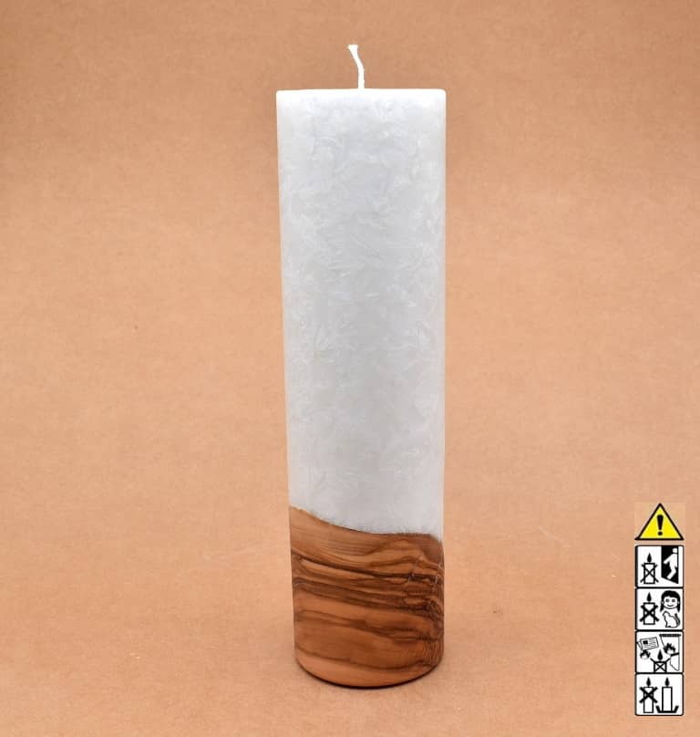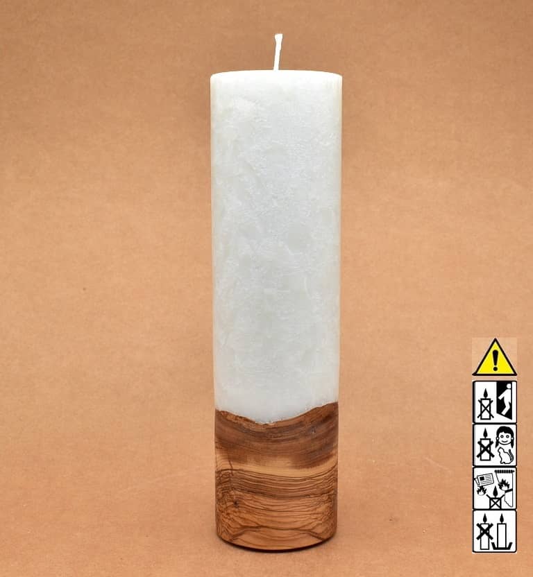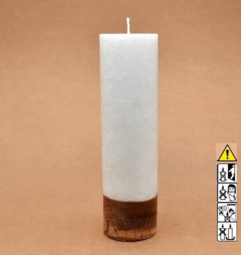 Runde Kerze in Stearinoptik 70 x 250 mm mit Holz und mit Dochteinsatz.