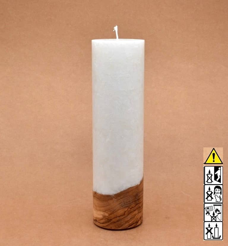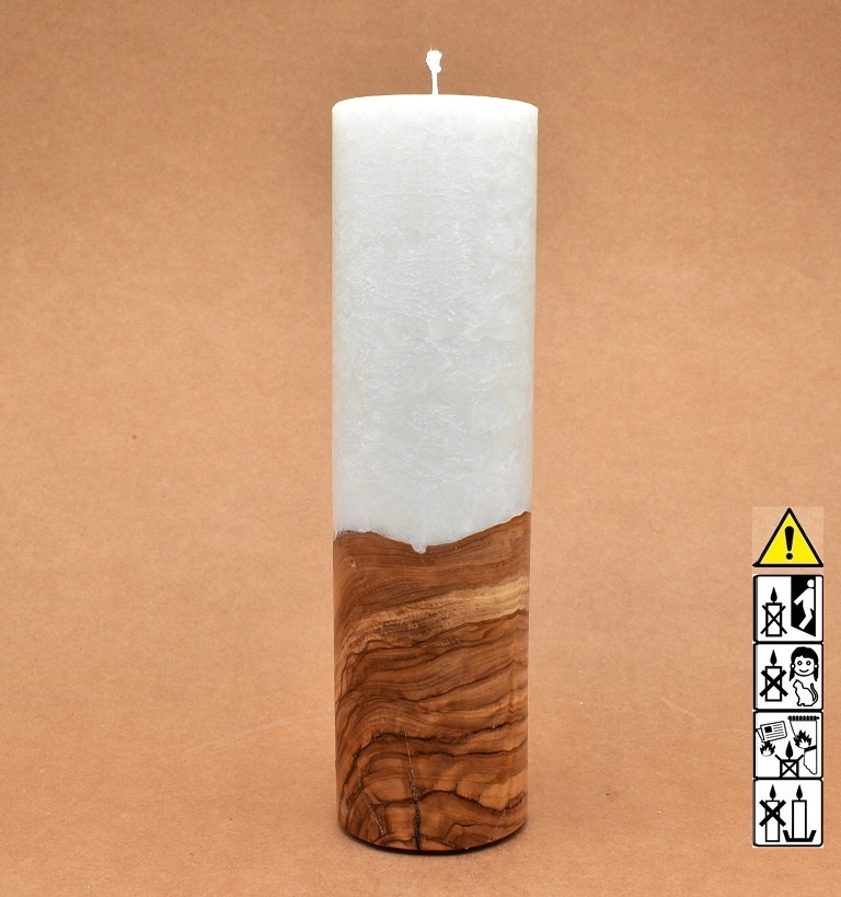 Runde Kerze in Stearinoptik 70 x 250 mm mit Holz und mit Dochteinsatz.