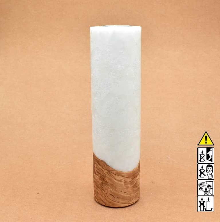 Runde Kerze in Stearinoptik 70 x 250 mm mit Holz und mit Teelichteinsatz.