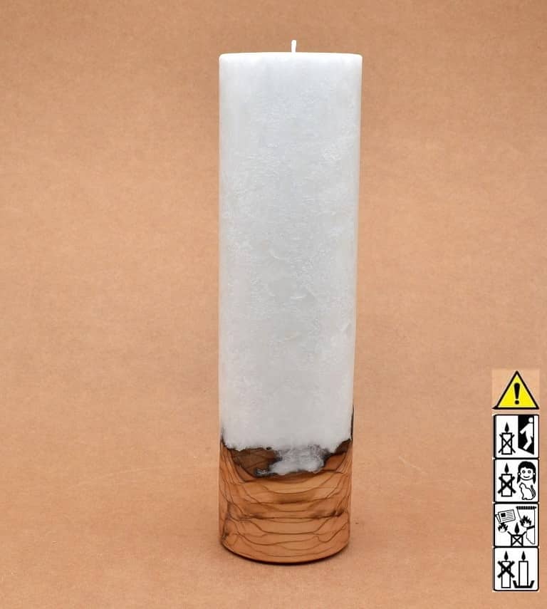 Runde Kerze in Stearinoptik 70 x 250 mm mit Holz und mit Teelichteinsatz.