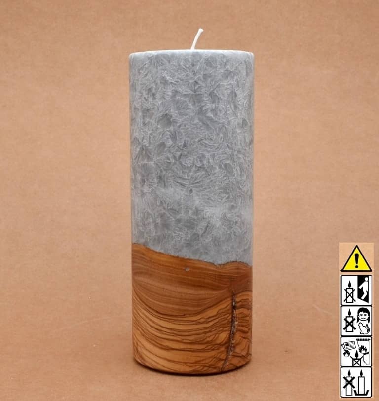 Kerze mit Holz Unikat Rund 80 x 200 mm mit Docht in silbergrau Nr.: 4