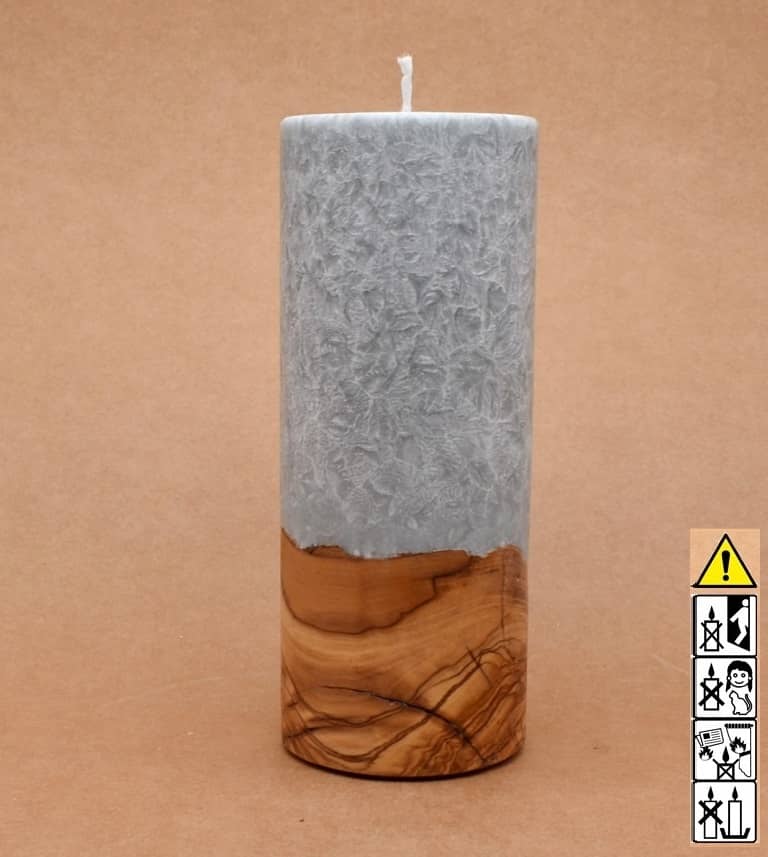 Kerze mit Holz Unikat Rund 80 x 200 mm mit Docht in silbergrau Nr.: 5