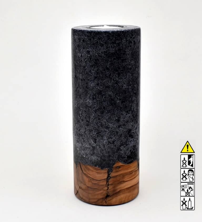 Kerze mit Holz Unikat Rund 80 x 200 mm mit Teelicht in schwarz