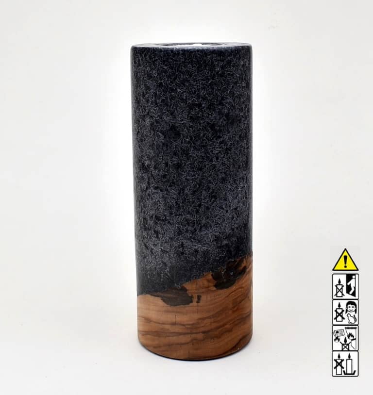 Runde Kerze in Stearinoptik 80 x 200 mm mit Teelicht und Holz in schwarz.