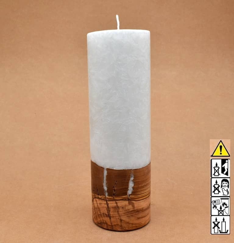 Runde Kerze in Stearinoptik 80 x 250 mm mit Holz und mit Dochteinsatz.