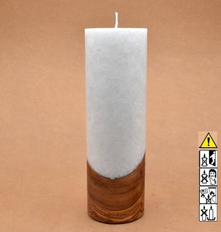 Runde Kerze in Stearinoptik 80 x 250 mm mit Holz und mit Dochteinsatz.