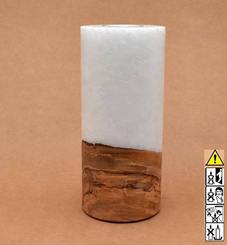 Runde Kerze in Stearinoptik 90 x 200 mm mit Teelicht und Holz.