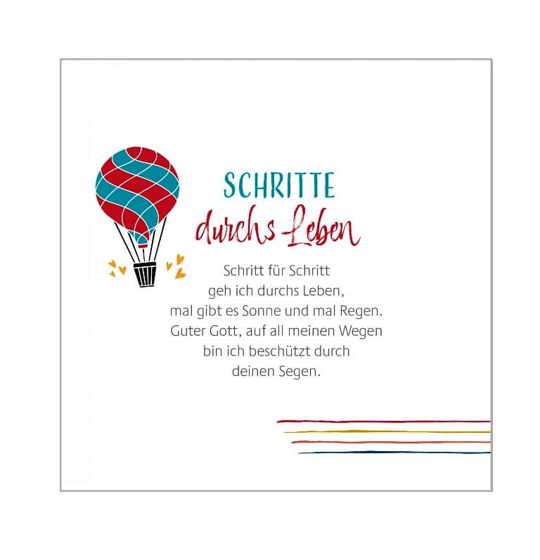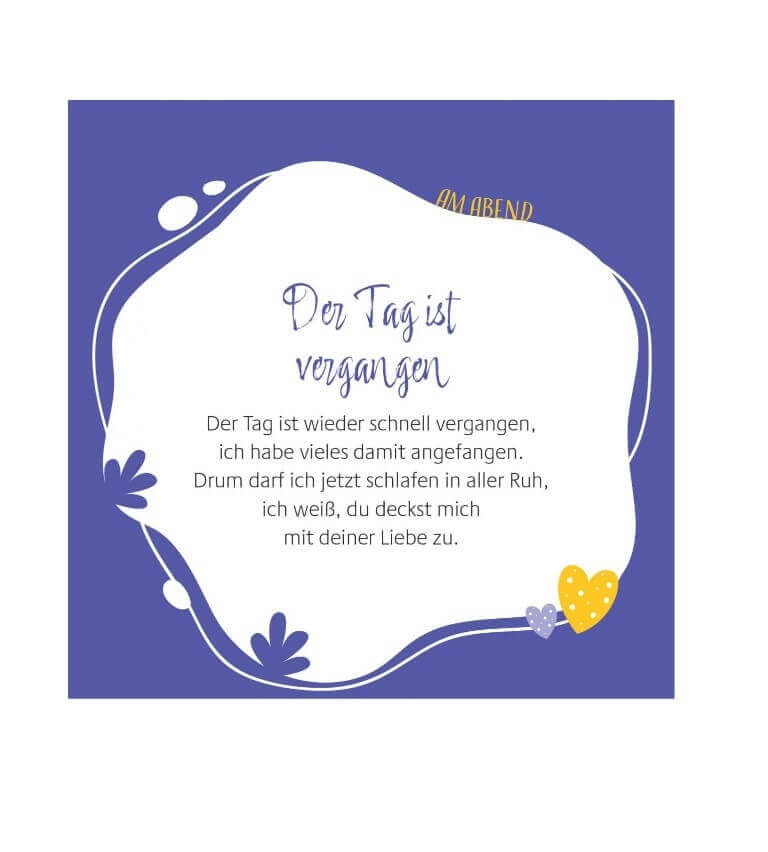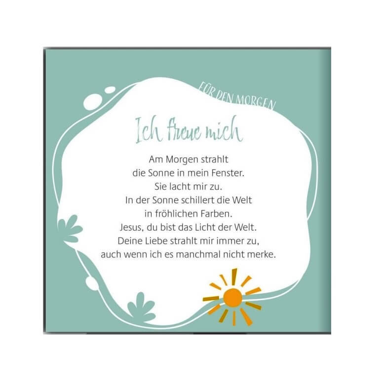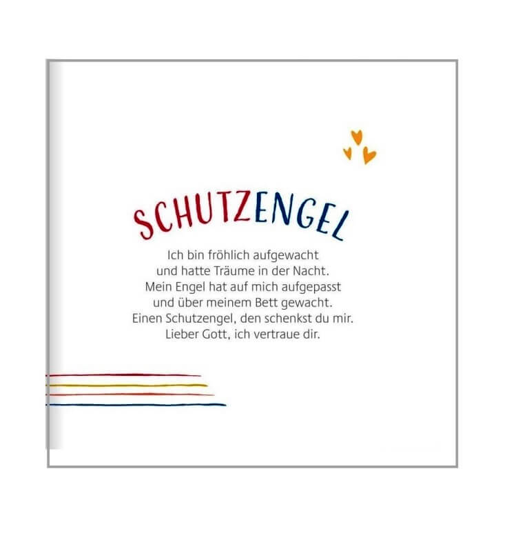Diese Zuversicht vermitteln die modernen Gebete in diesem praktischen Aufstellbuch. Mit ihren liebevollen und einfühlsamen Texten begleitet die Autorin Kinder durch den Tag: Vom Morgengebet, über den Dank vor dem Essen bis zum Abendritual – für jeden Anlass findet sich hier das passende Gebet. Dabei werden Themen aufgegriffen, die Kinder beschäftigen. Ob Familie, Freundschaft, Streit, Traurigkeit oder Freude – Mädchen und Jungen lernen, dass sie Gott alles anvertrauen können und spüren: Gott hat mich lieb. Bei ihm bin ich geborgen.