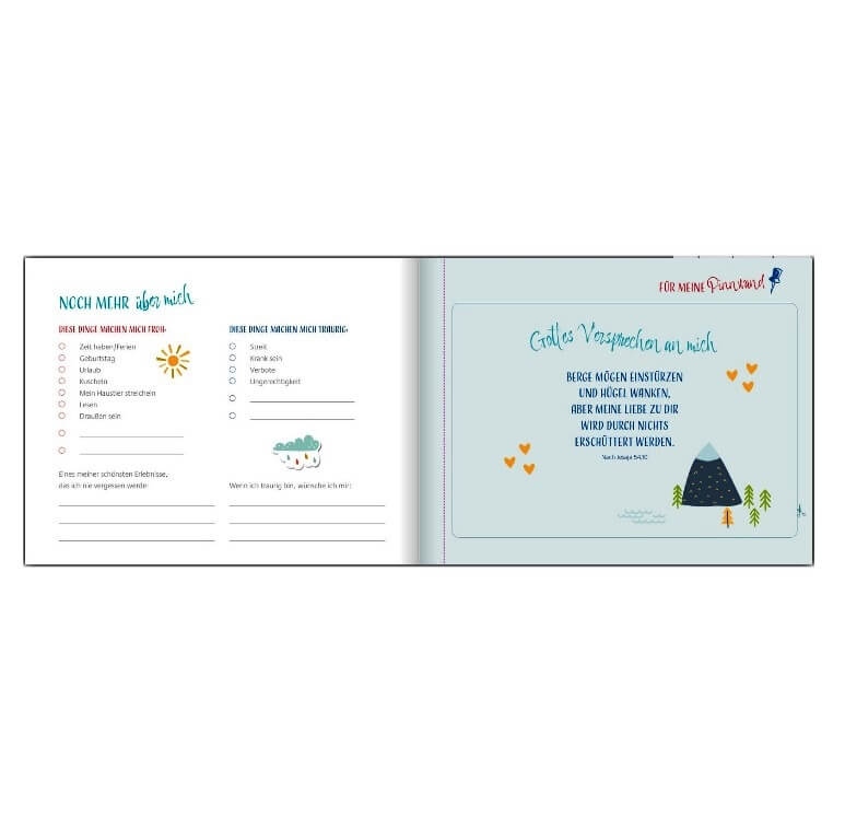 Viel Platz für Erinnerungen und Fotos: Die liebevoll gestalteten Innenseiten bieten Raum für Lieblingsfotos, persönliche Eintragungen, gute Gedanken und Wünsche für die Zukunft. Auch kleine Andenken wie z.B. die Einladungskarte können eingeklebt werden.