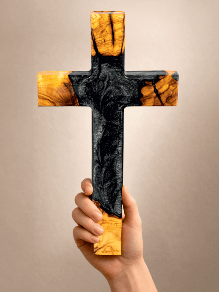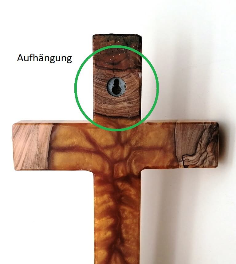Olivenholzkreuz mit Epoxidharz in kupferbraun H=30cm B=16cm T= 2,3cm (Breite Holz=3,5cm)