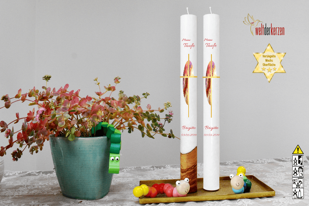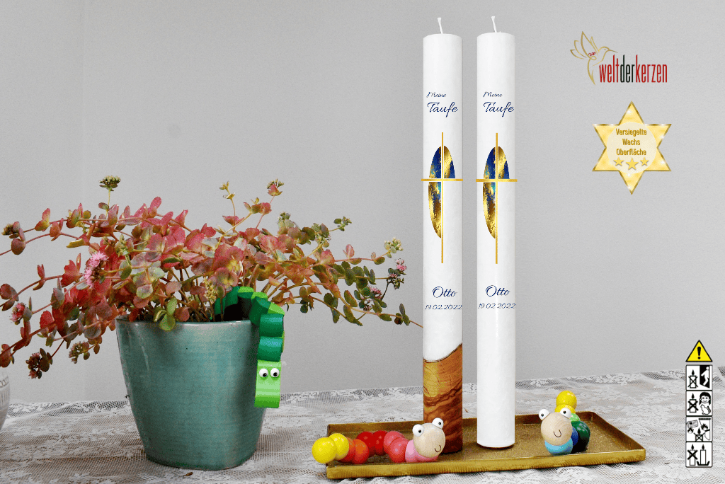 Durch das Personalisieren Ihrer Taufkerze entsteht eine einmalige Optik, welches die Kerze für Sie zu einem Erinnerungsstück und Wegbegleiter macht.