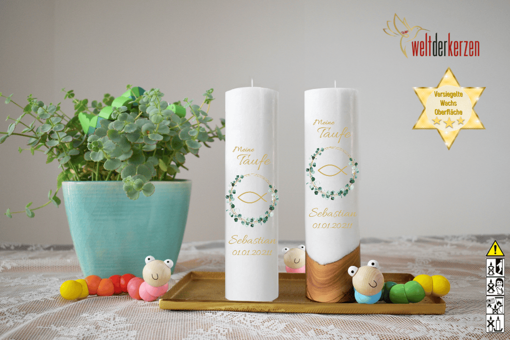 Durch das Personalisieren Ihrer Taufkerze entsteht eine einmalige Optik, welches die Kerze für Sie zu einem Erinnerungsstück und Wegbegleiter macht.