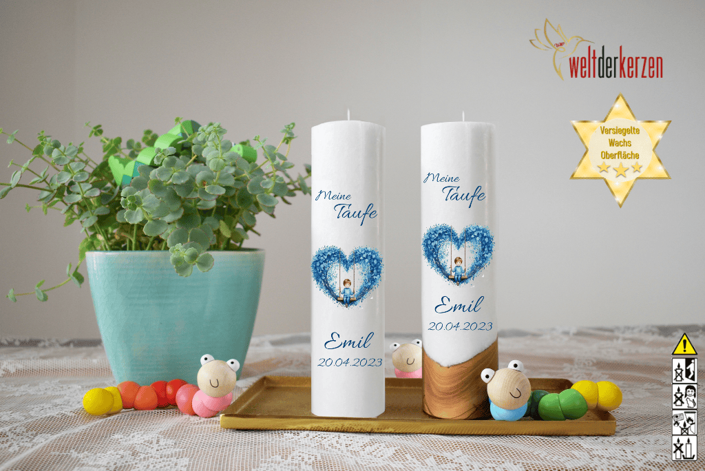 Taufkerze "Herzschaukel in Blau" Ø 6 oder 7 x 25cm "selbstgestaltet und Oberfläche versiegelt "
