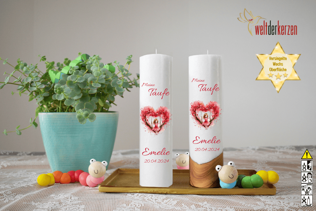 Taufkerze "Herzschaukel in Rosa" Ø 6 oder 7 x 25cm "selbstgestaltet und Oberfläche versiegelt "