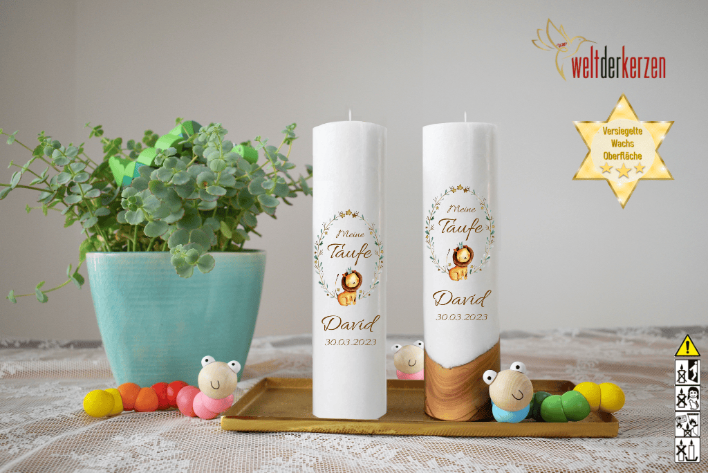 Taufkerze "Löwe" Ø 6 oder 7 x 25cm "selbstgestaltet und Oberfläche versiegelt "