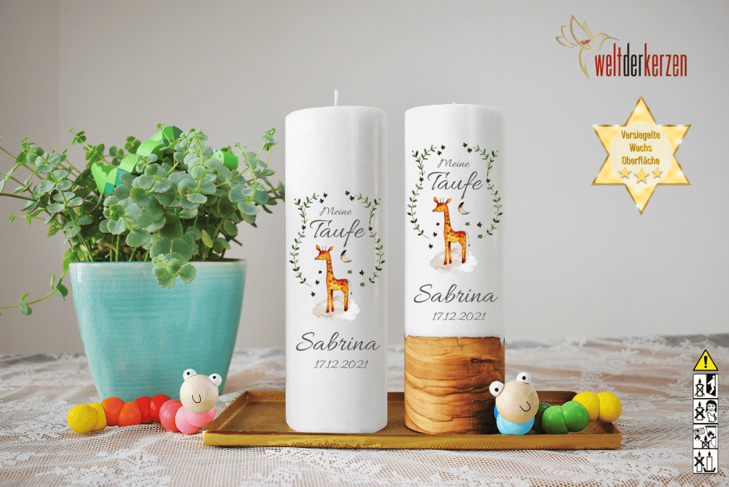 Taufkerze "Giraffe" Ø 8 x 20cm oder 25cm "selbstgestaltet und Oberfläche versiegelt "