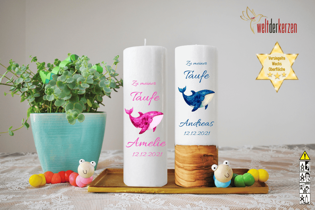 Taufkerze "Wal" Ø 8 x 20cm oder 25cm "selbstgestaltet und Oberfläche versiegelt "