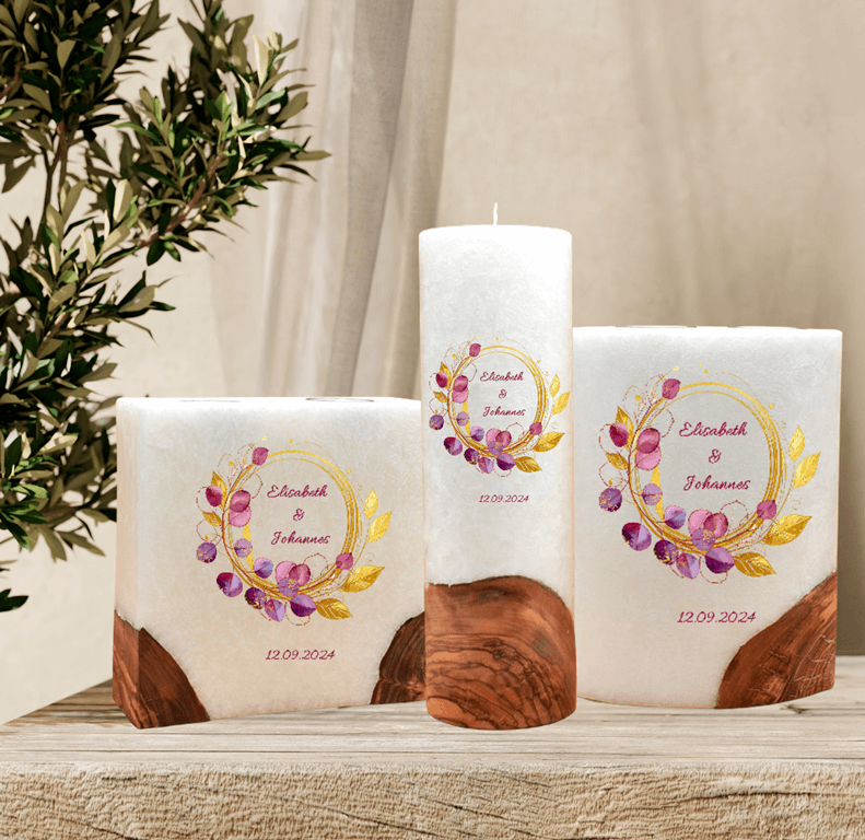 Hochzeitskerze "Eukalyptus Bordaux" mit 2 Holzelementen und 2 Teelichter 20 x 20 cm und Oberfläche versiegelt "Hochzeitskerze mit Holzelement aus Stearin.Eine einmalige Optik durch das Eingießen des Holzelementes, welches für sich schon ein Unikat ist.Liebevolle Handarbeit für ein Kunstwerk aus Holz und Wachs.Jede Kerze mit Holz wird von Hand hergestellt und bearbeitet.Durch das Personalisieren Ihrer Hochzeitskerze entsteht eine einmalige Optik, welches die Kerze für Sie zu einem Erinnerungsstück und Wegbegleiter macht.Sie erhalten vor der Anfertigung einen Entwurf (Bild) mit der Originalkerze zur Freigabe.1 x Korrektur ist kostenfrei.Jede unserer hochwertigen individuellen Hochzeitskerzen wird mit Hilfe von hochwertigen LED- und/oder UV-Druckverfahren veredelt.Die Verzierungen sind Oberflächenversiegelt und können daher auch normal angefasst werden.Die Versiegelung wird durch Handarbeit aufgebracht und hat in sich eine eigene Struktur.Diese Abbildung ist nur ein Beispielbild. Die Holzoptik kann vom Bild erheblich abweichen.Gerne können Sie sich eine Wunschkerze direkt bei unseren Kerzen aus Holz aussuchen.Dekomaterial ist nicht Bestandteil der Bestellung.Hersteller-Artikel-Nr.: RUGHZT200226