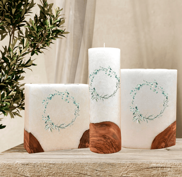 Eucalyptuskranz - Hochzeitsmotiv für Kerze mit Holzelement