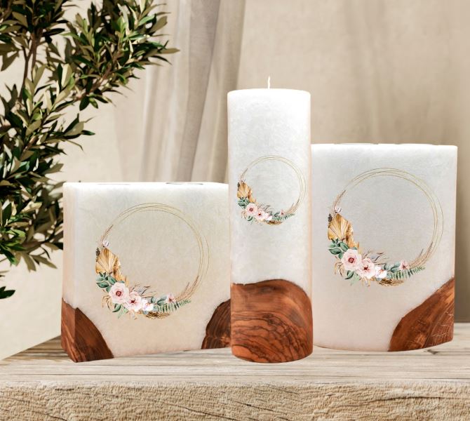 "Rustica Kranz" - Hochzeitsmotiv für Kerze mit Holzelement